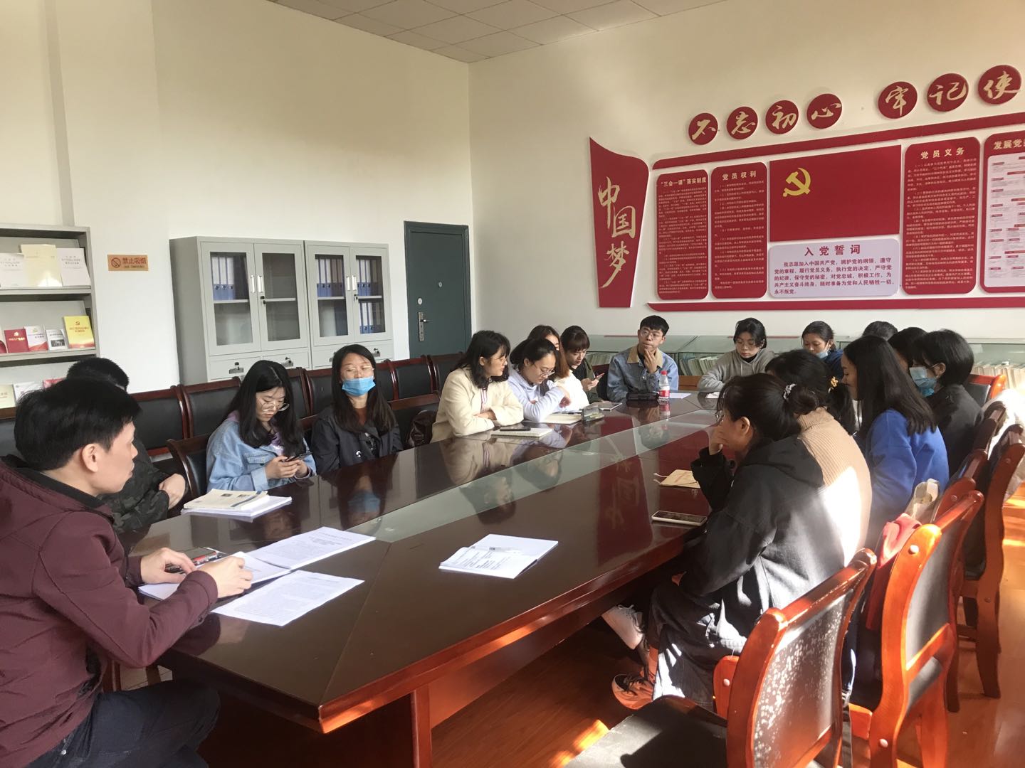 2020年10月21日中午,学院党委在314“党员之家”组织召开各学生支部委员培训会,全体学生支部副书记及组织委员参加,文学院党委办主任夏云飞老师主讲,学工办辅导员王倩老师参加了此次培训会。