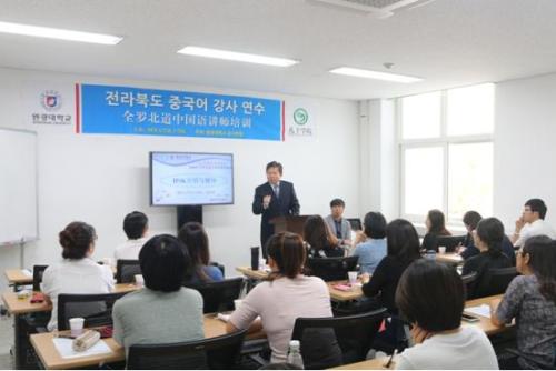 据介绍,为韩国全罗北道本土汉语教师培训是孔院最为重要的一项活动。这些教师分散活跃在各地中小学、幼儿园和补习班的课堂上,组织并培训他们,是孔院本土化工作的一大重点。孔院邀请韩国著名讲师和中国的语言学家给大家讲座,分享了有关教育心理学、教学技巧和汉语语法、韩国学生语法常见偏误等方面知识,一年2次,效果很好。