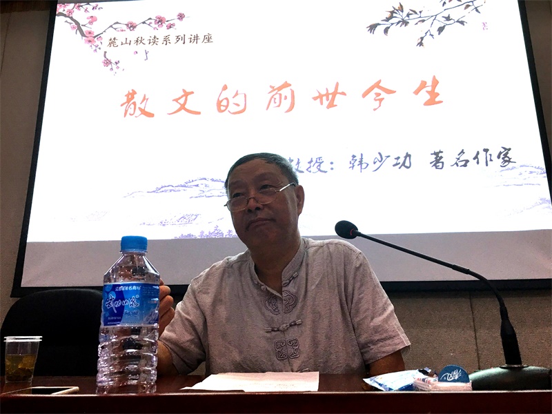 (通讯员 张明 樊婧)9月27日上午,文学院“麓山秋读系列讲座”第四场在216教室举行。著有《爸爸爸》、《马桥词典》、《山南水北》等作品的著名作家、湖南师范大学讲座教授韩少功,做客文学院,进行了主题为“散文的前世今生”的讲座。文学院教授李作霖主持讲座。