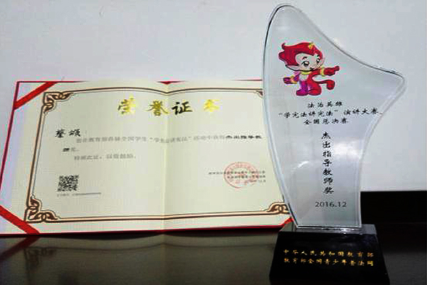 (供稿 文学院)近日,由教育部主办的首届全国学生“学宪法讲宪法”主题演讲大赛活动在北京全国青少年法治教育实践示范基地圆满结束,我省代表队获奖总成绩居全国第一,我校教师蔡颂被教育部授予“杰出指导教师奖”,全国高校仅5名教师获此殊荣。教育部副部长郝平、教育部政策法规司司长孙霄兵、北京外国语大学党委书记韩震等出席颁奖典礼。