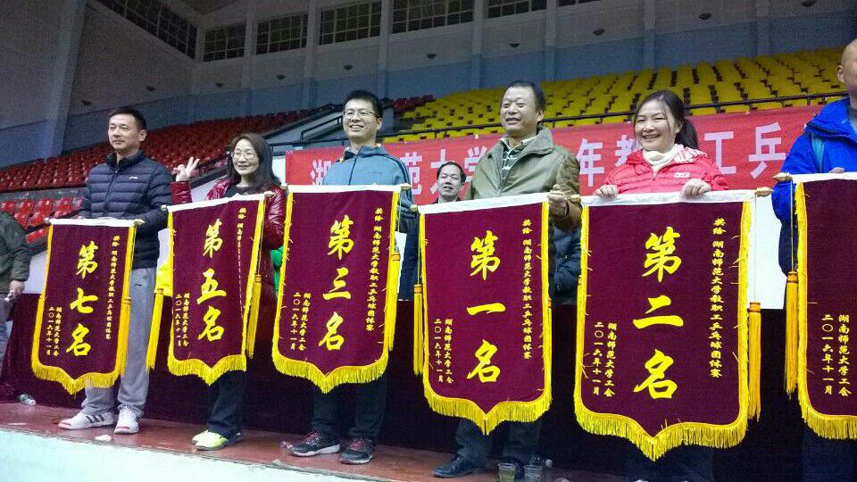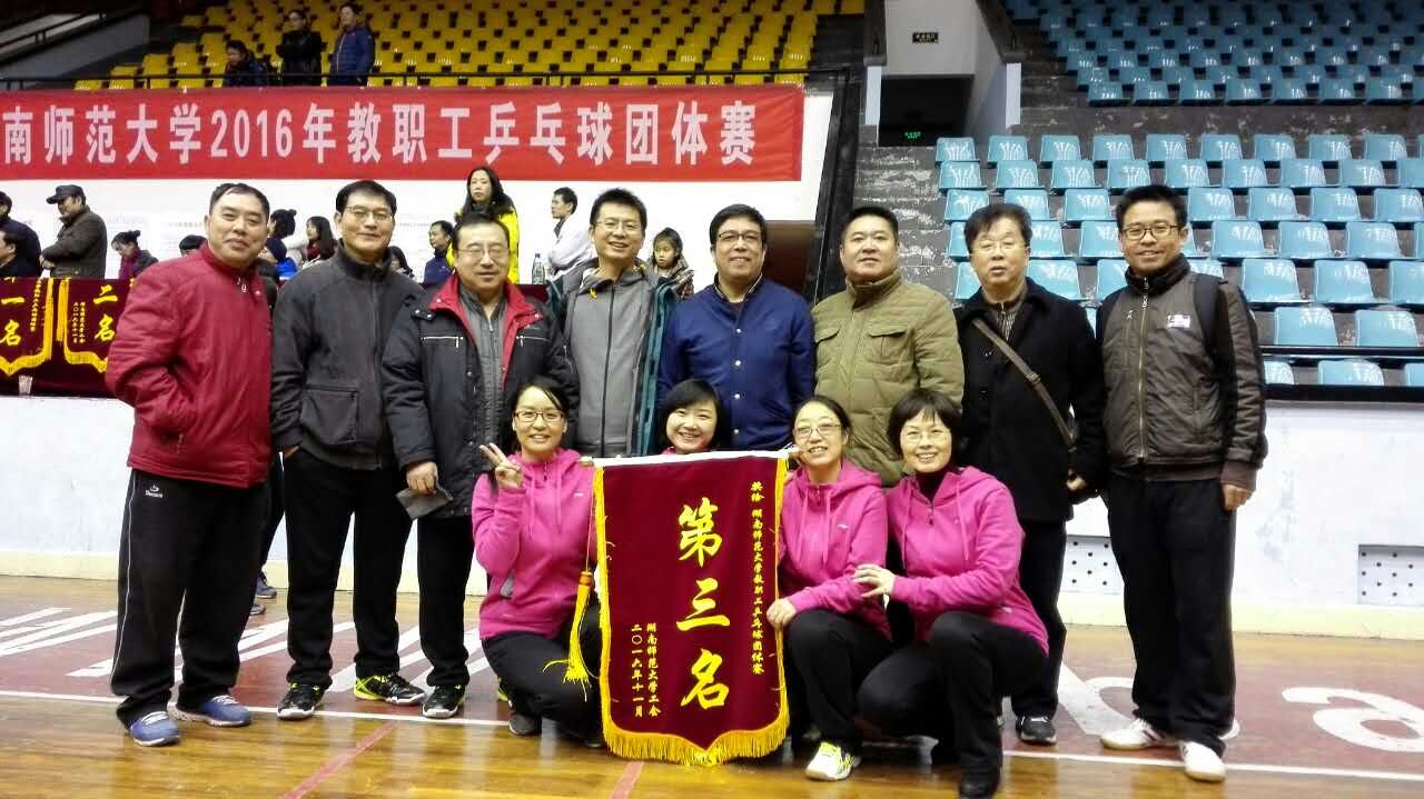 (院工会 供稿)11月25日至26日,2016年度湖南师范大学职工乒乓球团体赛在校体育馆举行。我院乒乓球运动队11名队员力战群雄,取得了团体赛第三名的好成绩。院党委书记李伶俐、院工会主席张良田、李树槐等老师到场为运动健儿鼓劲加油。