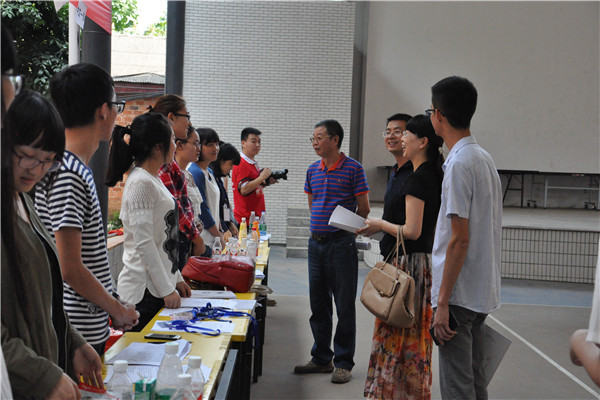 下午,周俊武副校长协同我校学工部何旭娟部长,以及校学生工作部网络教育办公室主任陈丽荣等领导抵达张公岭校区。看到迎新的学生工作人员,周俊武亲切示意同学们无须紧张,平常对待,并给予学生工作人员赞扬。周俊武向熊剑峰等人询问了接下来的日常流程,查看下午在图书馆即将召开的家长会现场,了解到招生报道情况。15级辅导员陈胜冲将文学院新生特刊《号角》予周俊武等人过目。