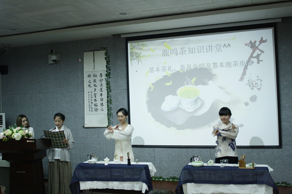 (湖南师范大学新闻网通讯员 谢吴越 张倩)5月20日晚,由湖南广播电视台茶频道、文学院团委主办,文学院鹿鸣茶艺社承办的“我知茶,我知爱——爱茶,爱人,爱人生”的520茶会活动在文学院217教室举行。在中南大学笛子协会王文熙演奏的悠悠古筝曲《渔舟唱晚》中,茶会表演正式开始。鹿鸣茶艺社成员带来暖场幽默相声《我请你喝茶》,引来现场观众一致叫 好。伴随着古琴曲响起,两位身着典雅衣裳的茶艺社成员走上表演台。一提、一托、一到、一点,再将盛在茶具中浸泡过的茶叶翻向观众,茶艺社成员素手执碗,只 为闻香。清水打旋倒入杯中,再经过温杯、去沫一系列调理,一壶清茶泡好。等候在旁的礼仪成员向嘉宾施以茶道特有的手法,将茶分杯端入会场,配上现场摆放的 茶点,可谓是“古色古香”。