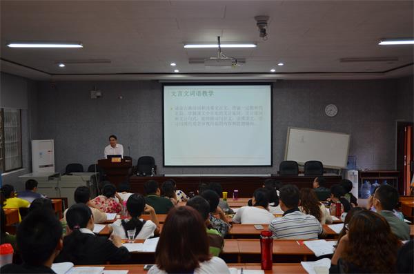 (通讯员王乐)9月18号下午,文学院教授蔡梦麒选取大量初中文言文语段,纠正了初中文言文词语注释中众多存疑之处,在文学院217教室与学员们共同探讨文言文词语教学方法。