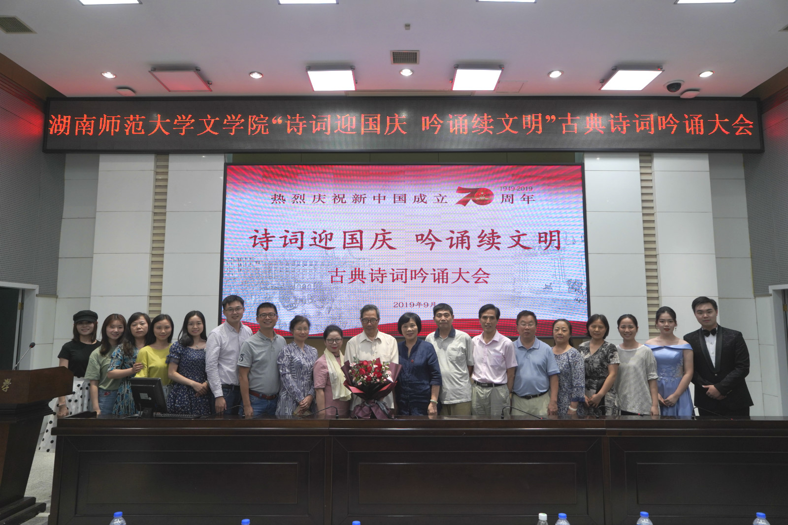 此次大会,文学院邀请在诗词创作领域成果斐然的多位前辈,通过近期录制的16个诗词朗诵与吟诵视频,表达对祖国大好河山和锦绣前程的无限热爱,为祖国70华诞献礼。其中,李维琦的《七律•去平江》展示了老一辈方言吟诵人的赤诚之心,曹琴现场吟诵毛泽东的《七律•答友人》,曲调婉转,韵味悠长,文学院青年教师代表蒋志远吟诵原创诗词,向吟诵界前辈学习致敬。老中青三代同台,带来了一场歌颂祖国七十华诞的语言、音乐、文化盛宴,赞颂了七十年中国取得的巨大成就。