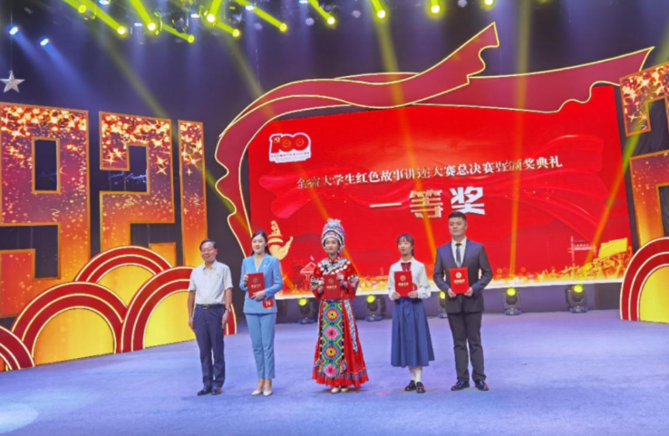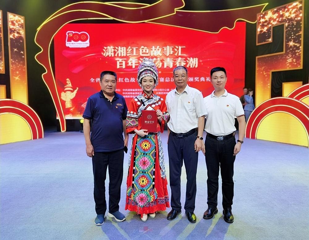 比赛现场,参赛选手们以湖湘革命先辈、开国将帅、英雄模范和在百年党史历程中具有重大影响的历史事件为基本素材,紧扣红色主题,从自身独特视角出发,讲述红色故事。我校文学院硕士研究生江静雪第一位出场,以《一首湘西民歌的家国情》为题,深情讲述了湘西土家民歌《马桑树儿搭灯台》背后集思想性、故事性、教育性于一体的红色故事,生动诠释了在百年党史中中国共产党员的初心使命与家国情怀,感动了在场所有评委与观众,最终荣获全省最高奖。
