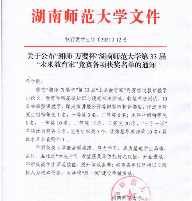 (通讯员 龚思静)11月17日晚,我校第33届“未来教育家”竞赛公布获奖名单,文学院学子延续传统表现优异。斩获特等奖3项、一等奖7项、二等奖5项、三等奖1项、“三字一话”单项奖3项,我院获得优秀组织奖,杨云萍老师获得优秀指导教师奖。据悉,在此次未来教育家竞赛中,本科生组全校20名选手进入决赛,文学院7名同学入围;研究生组全校共5名同学进入决赛,文学院4名同学入围。
