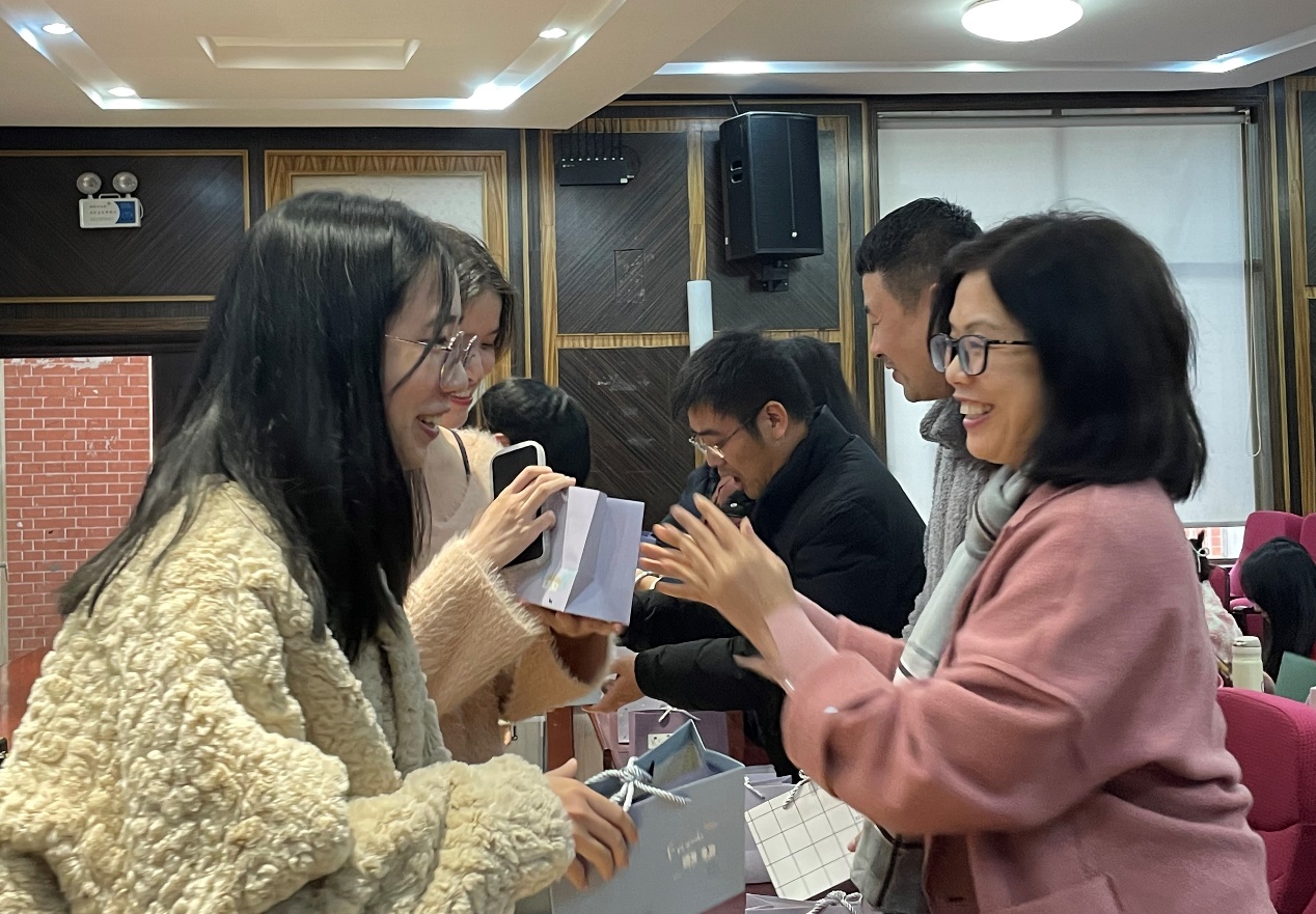 文学院为考研备考生们准备了福袋,福袋内有锦鲤护体小福袋、考研必胜钥匙扣和金榜题名水性笔等礼物,饱含学院祝福寓意。全体班导师向与会考生发放福利袋礼物,并表达对考生们的祝福与期望。