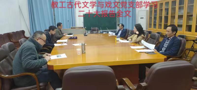 教工古代文学与戏文党支部深入学习并热烈讨论了党的二十大精神。一致认为,总书记在报告第八点“推进文化自信自强,铸就社会主义文化新辉煌”中,特意指出要“传承中华优秀传统文化”,对广大传统文化与文学研究者来说是极大的激励和鼓舞。我们会秉承总书记的指示,更加努力地从事传统文化与文学的教学与研究工作,在文献学、古代文学、古代文化、电影学等领域持续发力,为传承中华优秀传统文化做出力所能及的贡献。