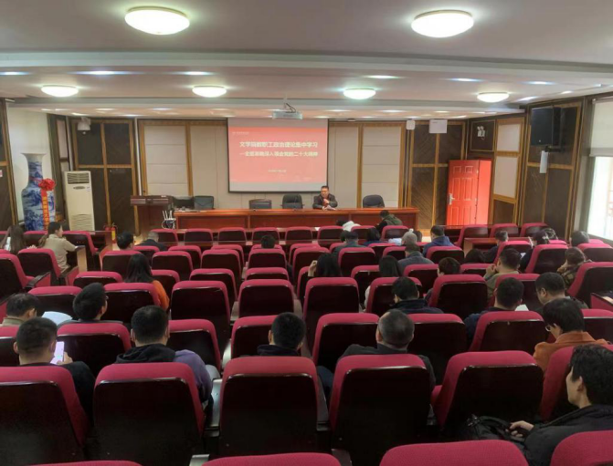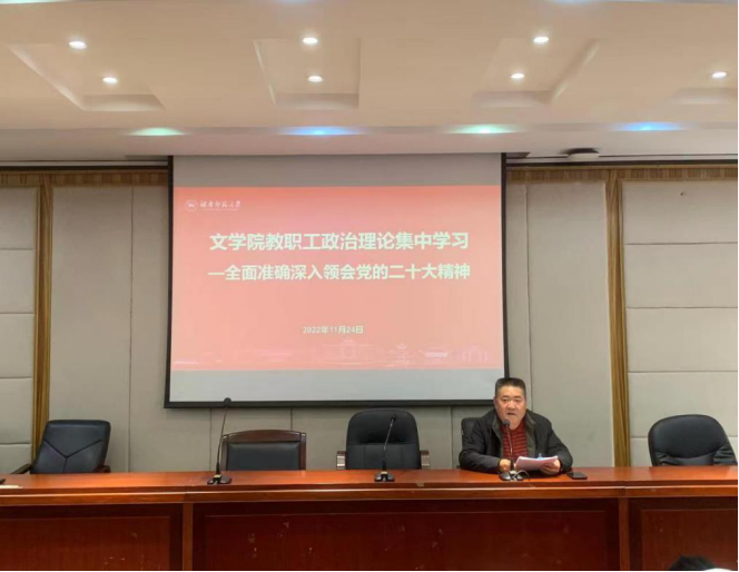 2022年11月24日下午,文学院在216报告厅召开全院教职工大会,开展政治理论集中学习,全面准确深入领会党的二十大精神,会议由院党委书记李伶俐主持。