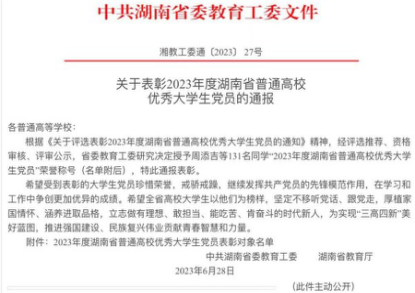 (通讯员 谢璐怡)6月28日,中共湖南省委教育工委、湖南省教育厅发布《关于表彰2023年度湖南省普通高校优秀大学生党员的通报》,我院2019级学生熊雨涵获此殊荣,受通报表彰。