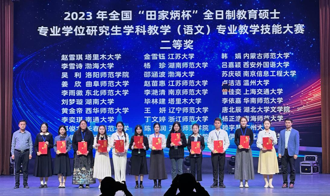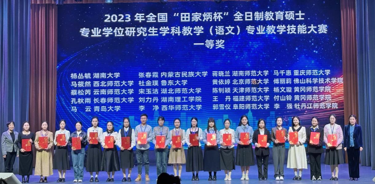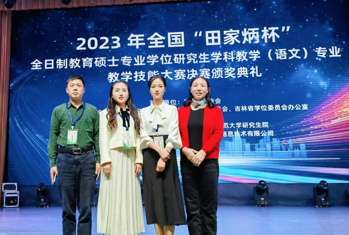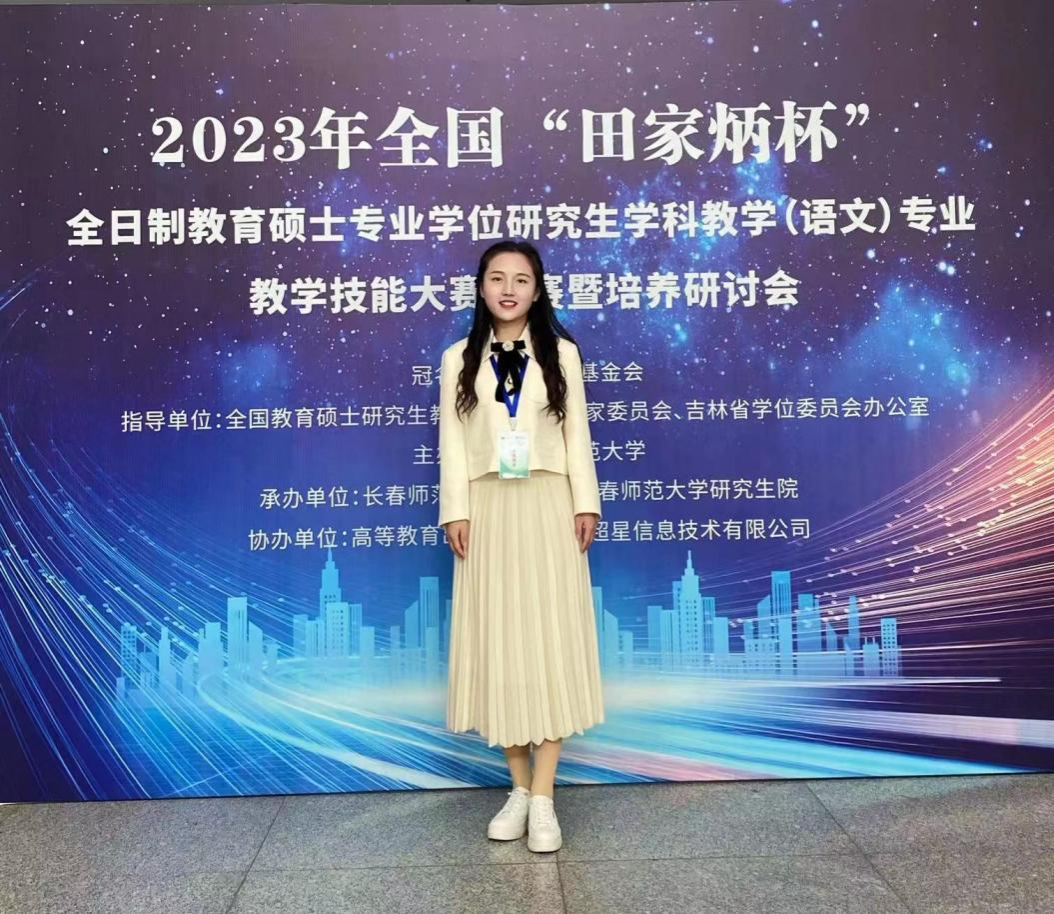 (通讯员蒋晓兰)10月15日,2023年全国“田家炳杯”全日制教育硕士专业学位研究生学科教学(语文)专业教学技能大赛决赛在长春师范大学圆满落幕,我校2022级学科教学(语文)研究生脱颖而出,成绩名列全国高校前茅,蒋晓兰荣获一等奖,杨珍荣获二等奖,刘光成荣获优秀指导教师奖。这是我校学科教学(语文)研究生在全国赛事中取得的又一次荣誉。