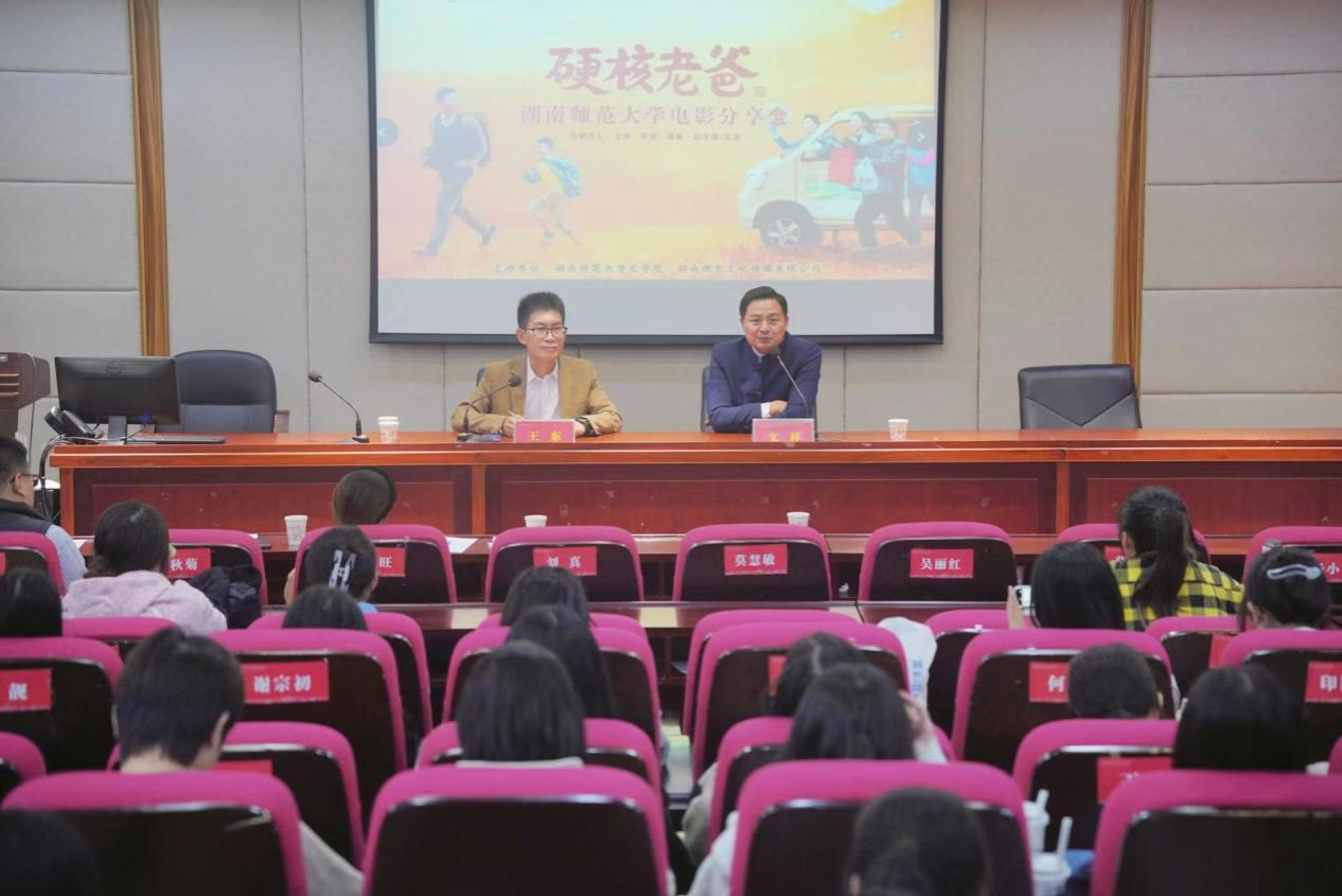 (通讯员刘库)11月10日下午,由湖南师范大学文学院、湖南砚泉文化传媒有限公司主办的电影《硬核老爸》观影分享会暨文祥“电影追梦人”主题演讲在文学院216教室开展。湖南砚泉文化传媒有限公司董事长文祥,湖南省电影评论协会秘书长王东,湖南师范大学文学院党委副书记刘宓蜜,湖南师范大学文学院戏剧影视文学系专任教师刘库,湖南师范大学文学院本科生与研究生等参加活动。活动由省广播电视台导演、省电影评论协会秘书长王东主持。