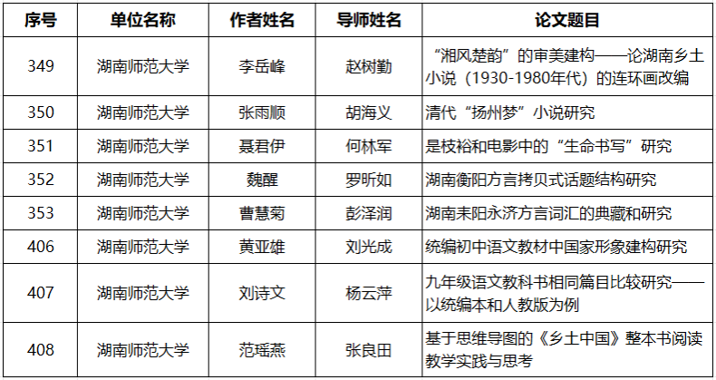 近日,在湖南省教育厅公布的“2023年湖南省优秀博硕士学位论文名单”中,我院赵树勤、胡海义、何林军、罗昕如、彭泽润、刘光成、张良田、杨云萍八位老师指导的硕士毕业论文荣获2023年湖南省优秀硕士学位论文。