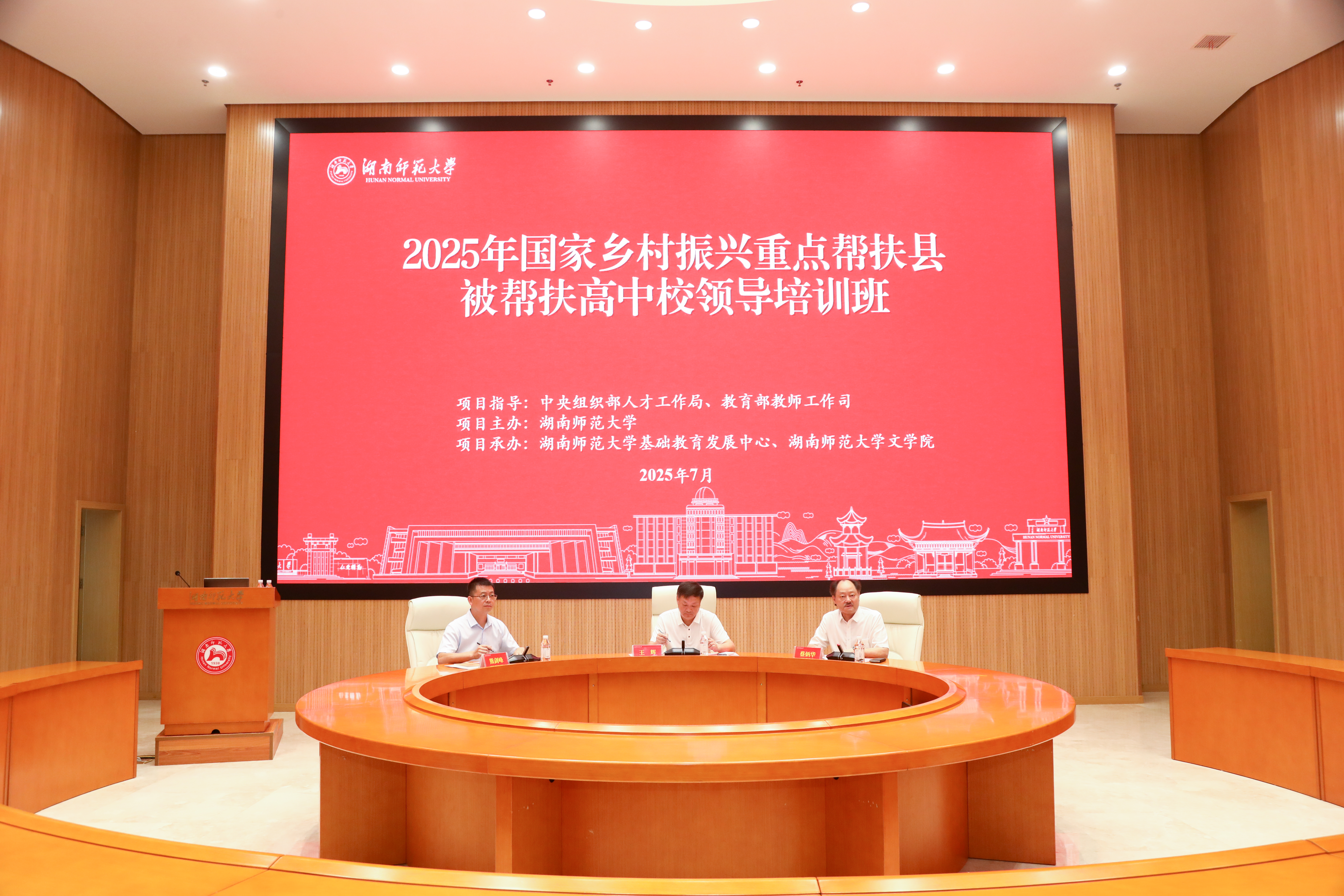 7月31日上午8:30,2025年国家乡村振兴重点帮扶县被帮扶高中校领导(普高/职高)湖南师范大学培训班开班典礼在湖南师范大学图书馆报告厅隆重举行。校党委委员、副校长王辉,基础教育发展中心主任蔡炳华,文学院党委书记熊剑峰出席典礼,来自西部10省(自治区、直辖市)的普高和职高校领导参加,典礼由蔡炳华主持。