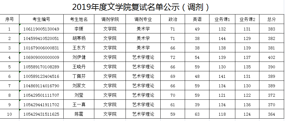 2019年度文学院复试名单公示(调剂)