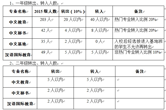 1、一年级转入、转出学生高考主要科目语文、数学、英语成绩至少一门须达到相应要求(语文或数学分及以上,英语分及以上,以分制换算)。上述证明材料需要学生自己提供,凡提供虚假证明材料者取消资格、后果自负。2、二年级转入、转出学生要求在校学习期间品行表现良好,文化课程总平均成绩按专业排名位居前35%,但转入学生名额将严格控制。转出学生上述证明材料由本院开具,转入学生需要所在院系提供,提供虚假证明材料者取消资格、后果自负。
