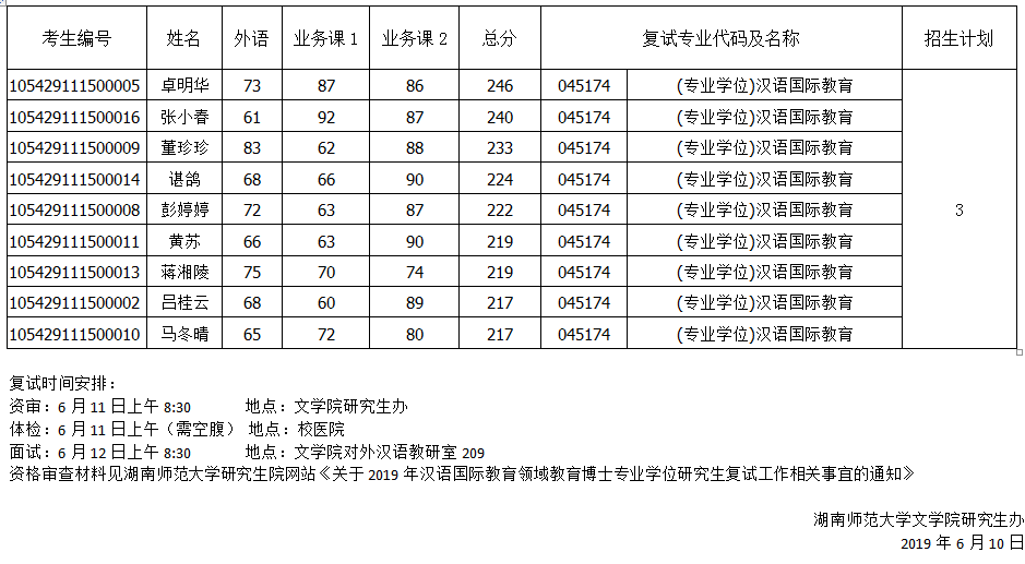 湖南师范大学2019年汉语国际教育领域教育博士研究生复试结果