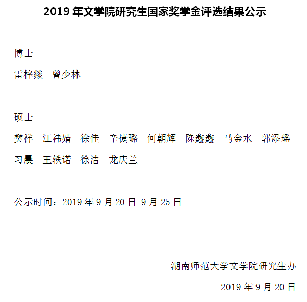 2019年文学院研究生国家奖学金评选结果公示