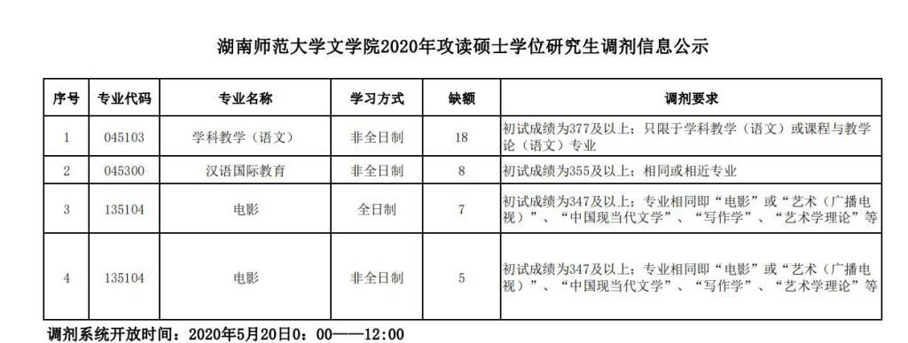 湖南师范大学文学院2020年攻读硕士学位研究生调剂信息公示
