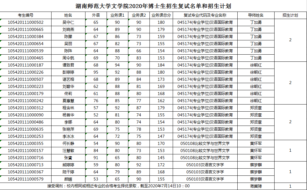 湖南师范大学文学院2020年博士招生复试名单和招生计划(更新)