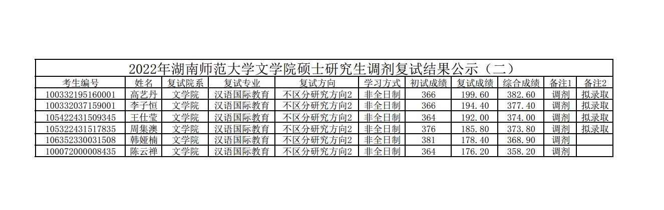 2022年湖南师范大学文学院硕士研究生调剂复试结果公示(二)