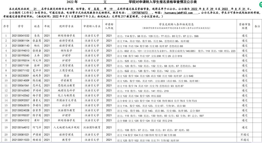 2022年文学院对申请转入学生报名资格审查情况公示表