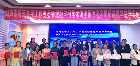 (通讯员:熊茁 单宇微)2021年5月21日下午,湖南省辞类汉字字根排检输入研究中心主办的“湖南省语言文字工作委员会课题申报学术讲座暨汉字字根形链识字教学实验基地授牌仪式”在岳阳市岳阳楼小学成功举行。我校文学院语言学教授彭泽润、兼职教授罗健以及硕士研究生佘欣慰出席并且做主题演讲。
