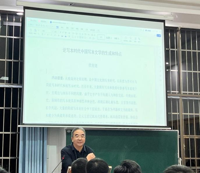 (通讯员高薇钿)11月23日晚,原西北师范大学、兰州大学教授,现西华师范大学文学院教授、国学院院长、四川省“千人计划”特聘教授、四川省学术与技术带头人伏俊琏教授,应邀在文学院古代文学教研室开展了以“论写本时代中国写本文学的生成和特点”为主题的精彩讲座。本次讲座由中国古代文学学科负责人蒋振华教授主持,古代文学专业的多位老师及众多古代文学和文献学研究生共同参加。