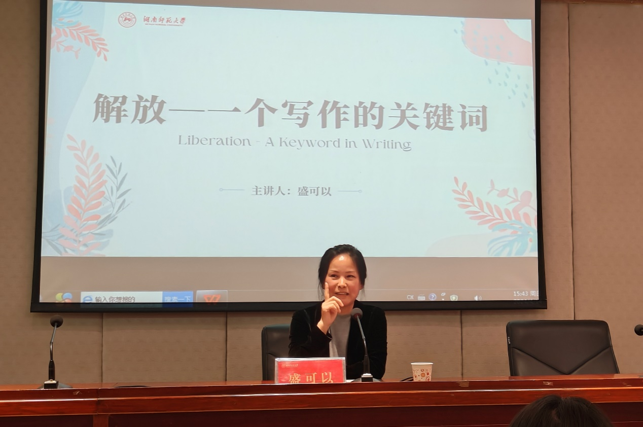 (通讯员李晨玮汪阳)4月14日下午,著名作家盛可以做客湖南师范大学文学院,做了以“解放—一个写作的关键词”为主题的讲座。讲座由创意写作导师郑朋教授主持,湖南省作家协会创研室主任贺秋菊、当代文学教研室许永宁老师,以及校内外众多文学爱好者参与了此次活动。