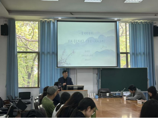 (通讯员何星临)4月17日上午10点,吉林大学文学院教授、博士生导师、教育部重大人才项目奖励计划特聘教授、中国古代文学理论学会会长、中国词学研究会常务理事彭国忠教授应邀莅临湖南师范大学文学院,进行“一首词的传奇——苏轼《定风波》(常羡人间琢玉郎)”的专题讲座。本次讲座由戏文系主任胡海义教授主持,长沙学院杨志君老师、我院赵晓岚老师与古代文学、古典文献学专业三十余名研究生参加。
